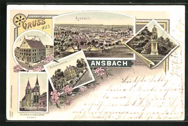 Lithographie Ansbach, Rathaus, Prinzenschloss, St. Johanniskirche