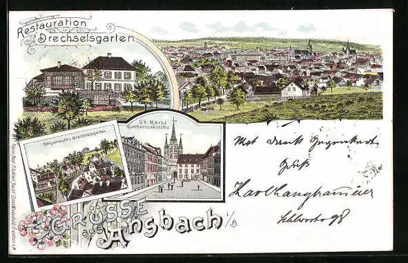 Lithographie Ansbach i. B., Restaurant Drechselgarten, Totalansicht