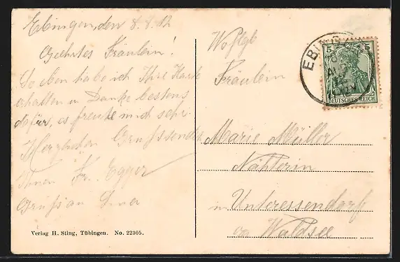 Personenbezogene Daten auf der Rückseite der Karte wurden durch blauen Textmarker unkenntlich gemacht. Die blauen Stellen sind auf die Vorderseite durchgeweicht und wirken sich negativ auf das Postkartenfoto aus