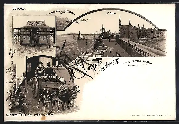 Lithographie Anvers, Le Quai, Laitiéres Flamandes avec Charette