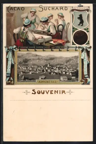 Lithographie Appenzell, Gesamtansicht, Weberinnen in Trachten, Wappen