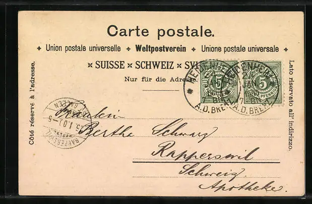 Personenbezogene Daten auf der Rückseite der Karte wurden durch blauen Textmarker unkenntlich gemacht. Die blauen Stellen sind auf die Vorderseite durchgeweicht und wirken sich negativ auf das Postkartenfoto aus