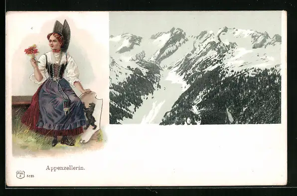 Lithographie Appenzellerin in Tracht mit Bergpanorama