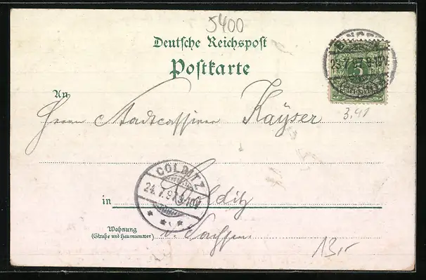 Personenbezogene Daten auf der Rückseite der Karte wurden durch blauen Textmarker unkenntlich gemacht. Die blauen Stellen sind auf die Vorderseite durchgeweicht und wirken sich negativ auf das Postkartenfoto aus