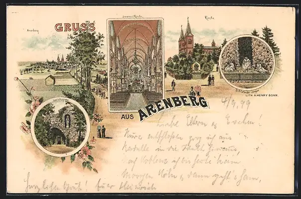 Lithographie Arenberg, Lourdesgrotte, Kirche, Schlafende Jünger