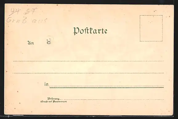 Personenbezogene Daten auf der Rückseite der Karte wurden durch blauen Textmarker unkenntlich gemacht. Die blauen Stellen sind auf die Vorderseite durchgeweicht und wirken sich negativ auf das Postkartenfoto aus