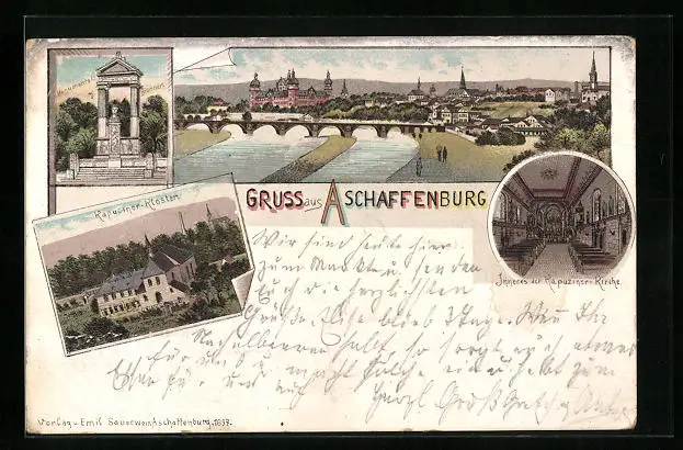 Lithographie Aschaffenburg, Monumentalbrunnen, Totalansicht, Kapuzinerkloster mit Innenansicht