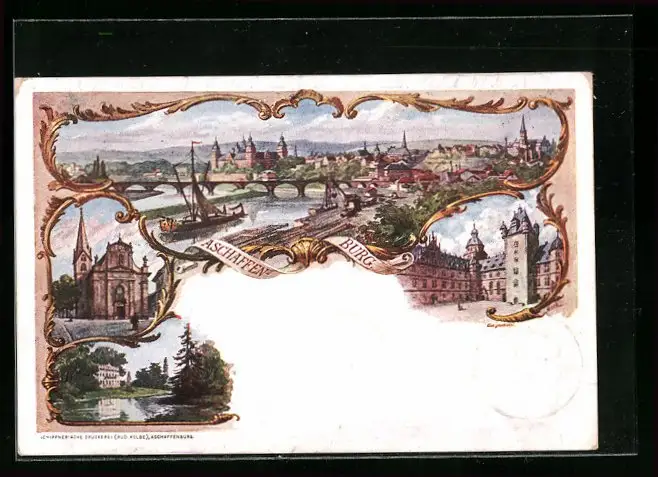 Lithographie Aschaffenburg, Panorama mit Fluss, Kirche und Marktplatz