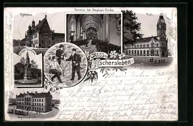 Lithographie Aschersleben, Gymnasium, Post, Krieger-Denkmal