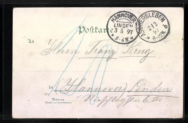 Personenbezogene Daten auf der Rückseite der Karte wurden durch blauen Textmarker unkenntlich gemacht. Die blauen Stellen sind auf die Vorderseite durchgeweicht und wirken sich negativ auf das Postkartenfoto aus