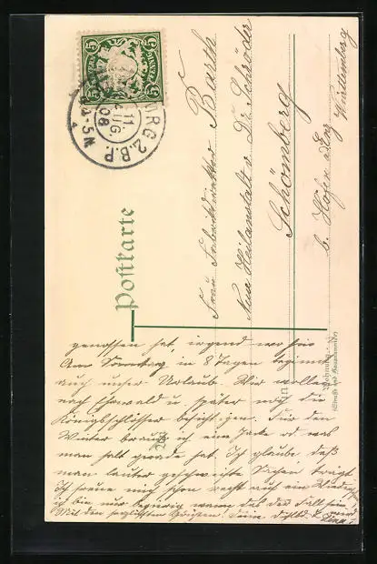 Personenbezogene Daten auf der Rückseite der Karte wurden durch blauen Textmarker unkenntlich gemacht. Die blauen Stellen sind auf die Vorderseite durchgeweicht und wirken sich negativ auf das Postkartenfoto aus