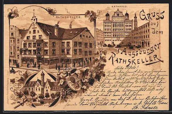 Lithographie Augsburg, Gasthaus Rathskeller, St. Maria Stern, Rathaus