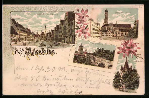 Lithographie Augsburg, Jakoberstrasse vom Thor aus, Rothes Thor