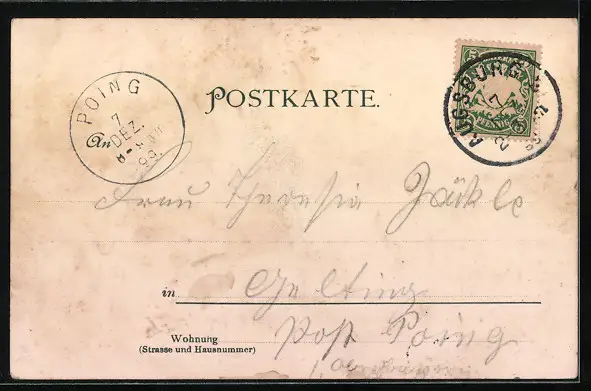 Personenbezogene Daten auf der Rückseite der Karte wurden durch blauen Textmarker unkenntlich gemacht. Die blauen Stellen sind auf die Vorderseite durchgeweicht und wirken sich negativ auf das Postkartenfoto aus