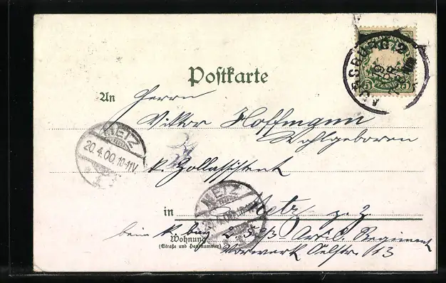 Personenbezogene Daten auf der Rückseite der Karte wurden durch blauen Textmarker unkenntlich gemacht. Die blauen Stellen sind auf die Vorderseite durchgeweicht und wirken sich negativ auf das Postkartenfoto aus