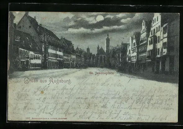 Lithographie Augsburg, St. Jakobsplatz mit alten Häusern