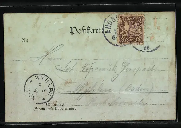 Personenbezogene Daten auf der Rückseite der Karte wurden durch blauen Textmarker unkenntlich gemacht. Die blauen Stellen sind auf die Vorderseite durchgeweicht und wirken sich negativ auf das Postkartenfoto aus