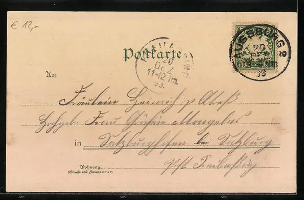 Personenbezogene Daten auf der Rückseite der Karte wurden durch blauen Textmarker unkenntlich gemacht. Die blauen Stellen sind auf die Vorderseite durchgeweicht und wirken sich negativ auf das Postkartenfoto aus