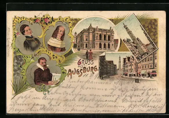 Lithographie Augsburg, Theater, Perlach-Turm, Untere Maximilianstrasse