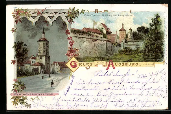 Lithographie Augsburg, Wertachbruckerthor, Rotes Thor