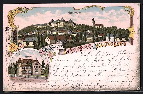 Lithographie Augustusburg, Waldhaus mit Strasse, Totalansicht