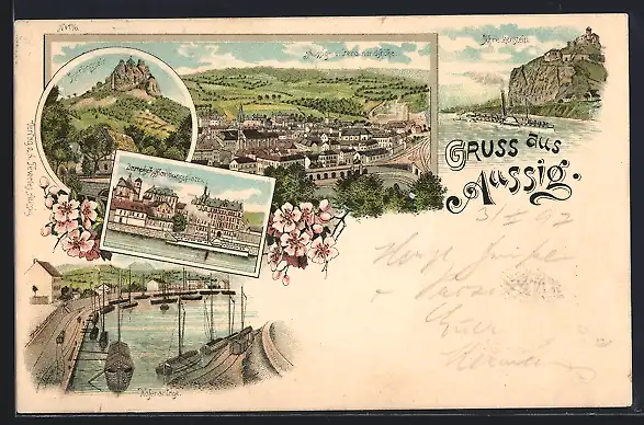 Lithographie Aussig / Usti, Hafen, Dampfschifflandungsplatz, Ruine Schreckenstein