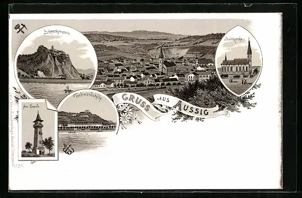 Lithographie Aussig / Usti, Stadtkirche, Am Brand, Ferdinandshöhe