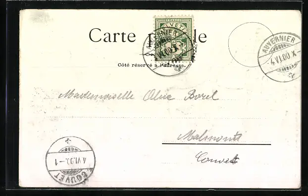 Personenbezogene Daten auf der Rückseite der Karte wurden durch blauen Textmarker unkenntlich gemacht. Die blauen Stellen sind auf die Vorderseite durchgeweicht und wirken sich negativ auf das Postkartenfoto aus