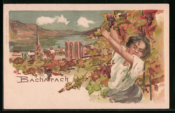Lithographie Bacharach, Teilansicht, Frau mit Trauben