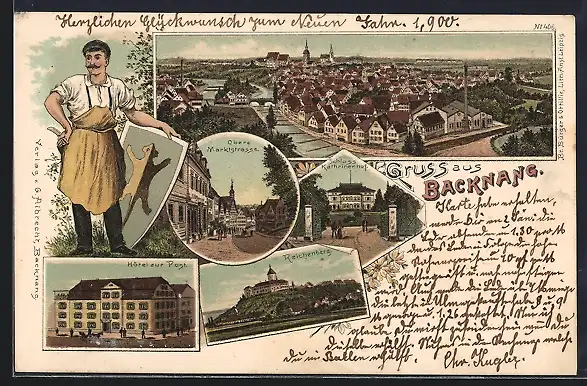 Lithographie Backnang, Hotel zur Post, Obere Marktstrasse, Schloss Kathrinenhof