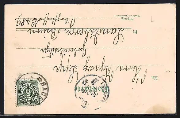 Personenbezogene Daten auf der Rückseite der Karte wurden durch blauen Textmarker unkenntlich gemacht. Die blauen Stellen sind auf die Vorderseite durchgeweicht und wirken sich negativ auf das Postkartenfoto aus