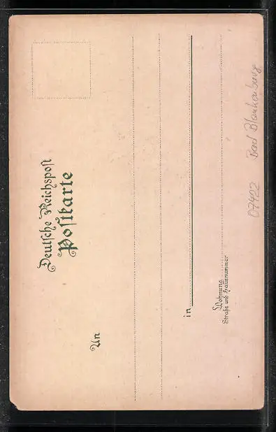 Personenbezogene Daten auf der Rückseite der Karte wurden durch blauen Textmarker unkenntlich gemacht. Die blauen Stellen sind auf die Vorderseite durchgeweicht und wirken sich negativ auf das Postkartenfoto aus