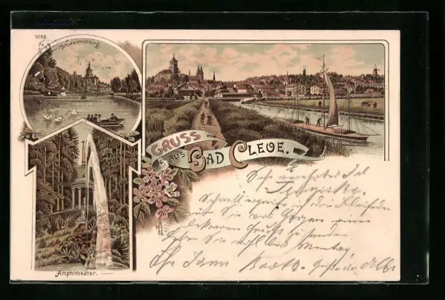 Lithographie Bad Cleve, Totalansicht mit Amphitheater und Schwanenburg