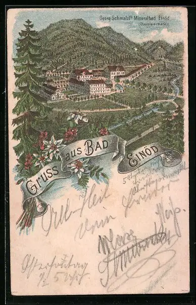 Lithographie Bad Einöd, Georg Schmalzls Mineralbad aus der Vogelschau
