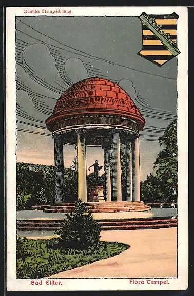 Lithographie Bad Elster, Flora Tempel mit Wappen
