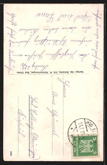 Personenbezogene Daten auf der Rückseite der Karte wurden durch blauen Textmarker unkenntlich gemacht. Die blauen Stellen sind auf die Vorderseite durchgeweicht und wirken sich negativ auf das Postkartenfoto aus