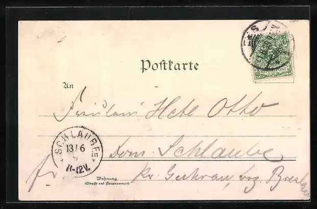 Personenbezogene Daten auf der Rückseite der Karte wurden durch blauen Textmarker unkenntlich gemacht. Die blauen Stellen sind auf die Vorderseite durchgeweicht und wirken sich negativ auf das Postkartenfoto aus