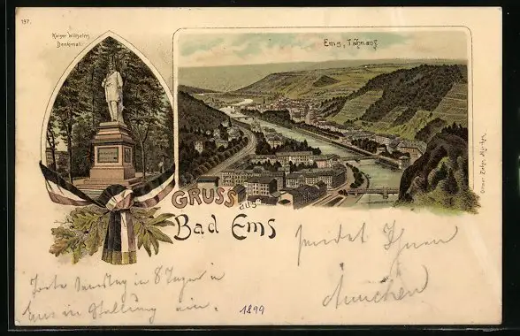 Lithographie Bad Ems, Kaiser Wilhelm Denkmal, Ortsansicht
