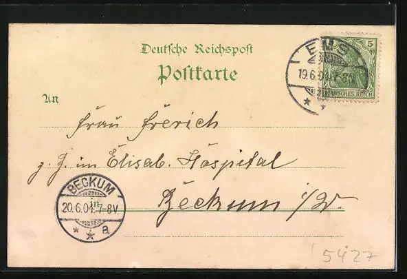 Personenbezogene Daten auf der Rückseite der Karte wurden durch blauen Textmarker unkenntlich gemacht. Die blauen Stellen sind auf die Vorderseite durchgeweicht und wirken sich negativ auf das Postkartenfoto aus