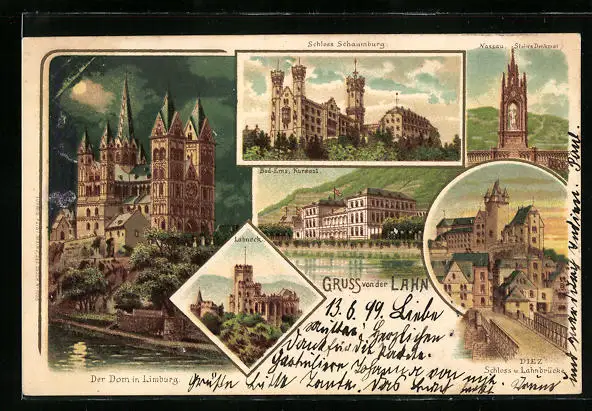 Lithographie Bad Ems /Lahn, Kursaal Bad Ems, Der Dom in Limburg bei Mondschein, Schloss Schaumburg