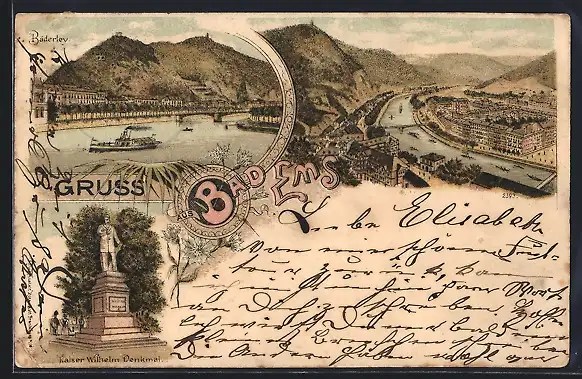 Lithographie Bad Ems, Ortsansicht aus der Vogelschau, Dampfer