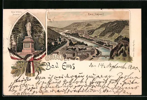 Lithographie Bad Ems, Ortsansicht mit Lahntal, Kaiser Wilhelm-Denkmal