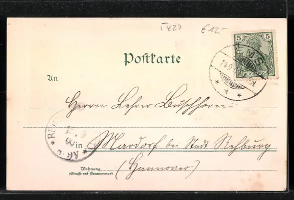 Personenbezogene Daten auf der Rückseite der Karte wurden durch blauen Textmarker unkenntlich gemacht. Die blauen Stellen sind auf die Vorderseite durchgeweicht und wirken sich negativ auf das Postkartenfoto aus
