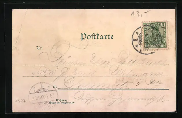 Personenbezogene Daten auf der Rückseite der Karte wurden durch blauen Textmarker unkenntlich gemacht. Die blauen Stellen sind auf die Vorderseite durchgeweicht und wirken sich negativ auf das Postkartenfoto aus