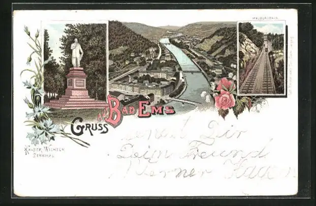 Lithographie Bad Ems, Panorama, Malbergbahn & Kaiser Wilhelm Denkmal