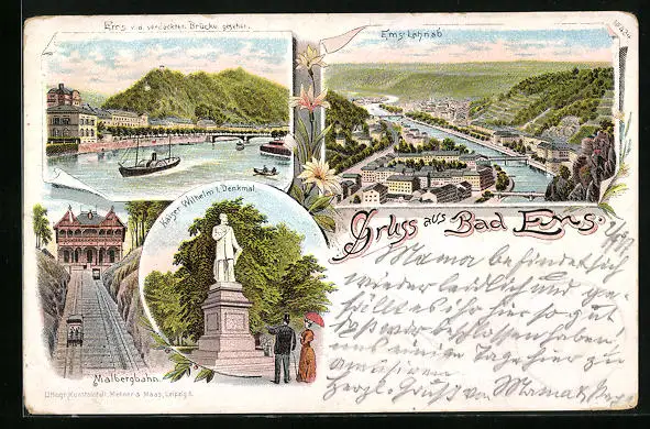 Lithographie Bad Ems, Totalansicht mit Malbergbahn