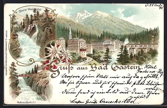 Lithographie Bad Gastein, Oberer Wasserfall, Schreckbrücke, Teilansicht