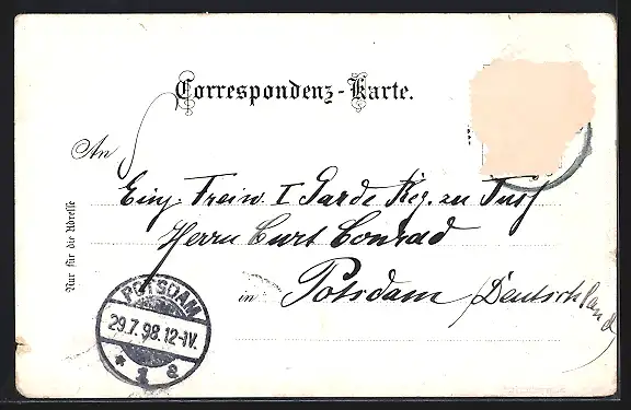 gelaufen 1898, Einriss re. unten, Briefmarke entfernt, rückseitig Oberflächenschaden, guter Zustand