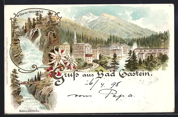 Lithographie Bad Gastein, Schreckbrücke, Oberer Wasserfall, Totalansicht
