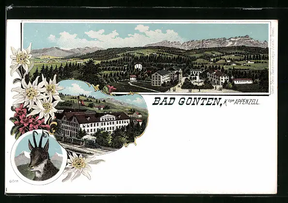 Lithographie Bad Gonten b. Appenzell, Ortsansicht aus der Vogelschau, Gämse im Portrait